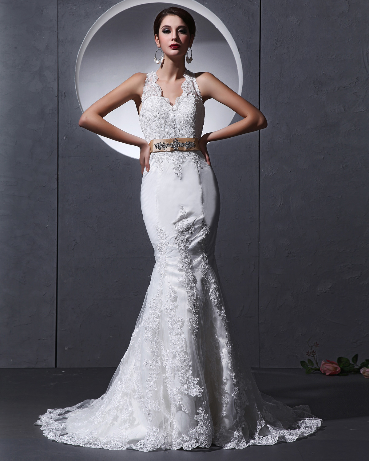 Sznurówka głęboki V otwarty z tyłu Halter szyja sukienki ślubne syrena Slim sukienki ślubne